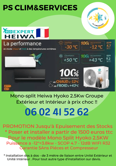 * Prix pour distance de 4m entre les Unités Intérieurs et Extérieurs avec 2m de goulotte extérieure, posé sur équerre murale ou bigfoot, perçage mur moins de 30 cm d'épaisseur, pas de frais de déplacement jusqu'à 30 km autour de Valence .